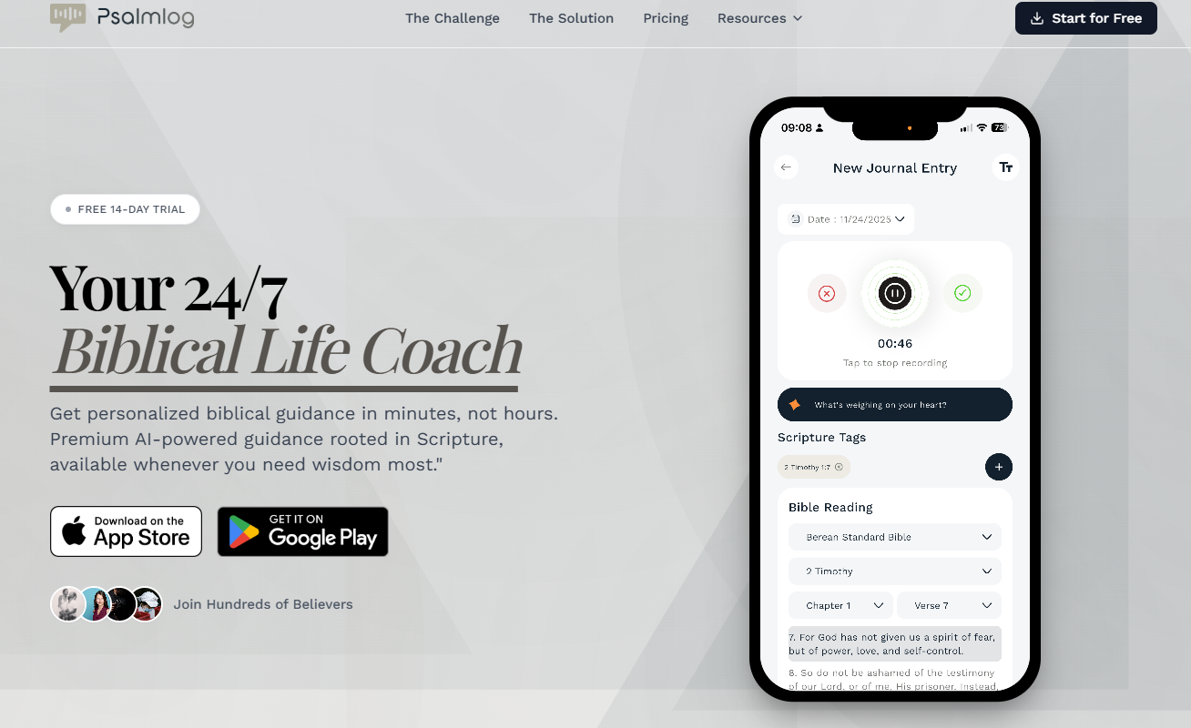 Com sua abordagem por voz, insights fundamentados e facilidade de uso, o Psalmlog torna o processo de oração e reflexão mais acessível mesmo para quem tem horários apertados.